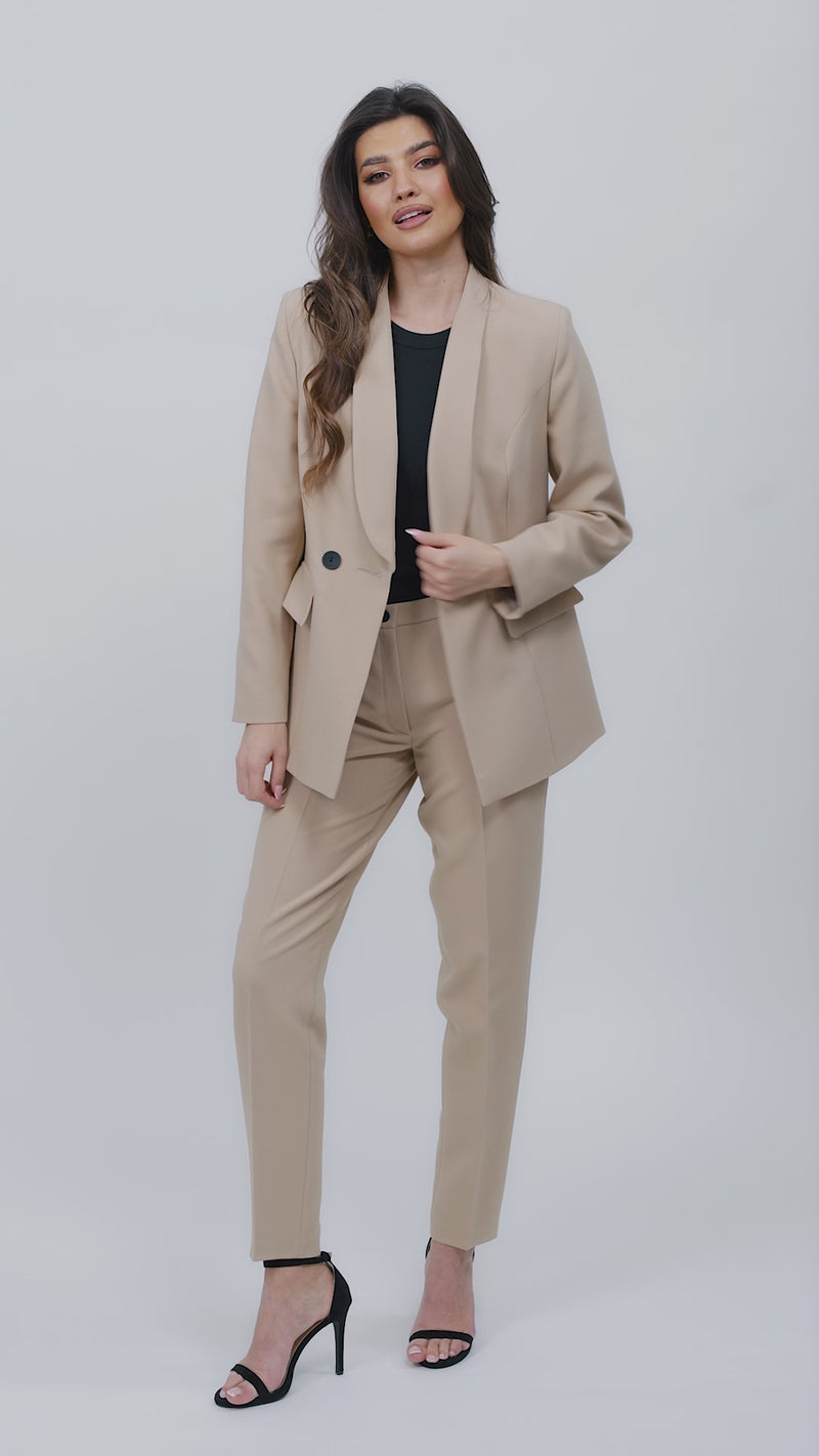 A long, elegant, double-breasted jacket with a classic shawl collar, long sleeves, and four-button placket. Two front pockets with flaps. A plain back with a concealed vent. Fitted and lined. Elegant, mid-rise trousers with tapered, pleated legs. Two side slit pockets at the front. Belt loops. Concealed zipper and button closure. Two welt pockets at the back.