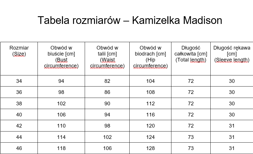 Zaokrąglone doły marynarki kamizelki tworzą subtelny, harmonijny efekt, dzięki czemu model doskonale komponuje się zarówno z eleganckimi spodniami, jak i z dżinsami, pełniąc funkcję stylowej bluzki lub kamizelki. Madison to propozycja dla kobiet ceniących uniwersalność, nowoczesny szyk i swobodę w codziennych stylizacjach.