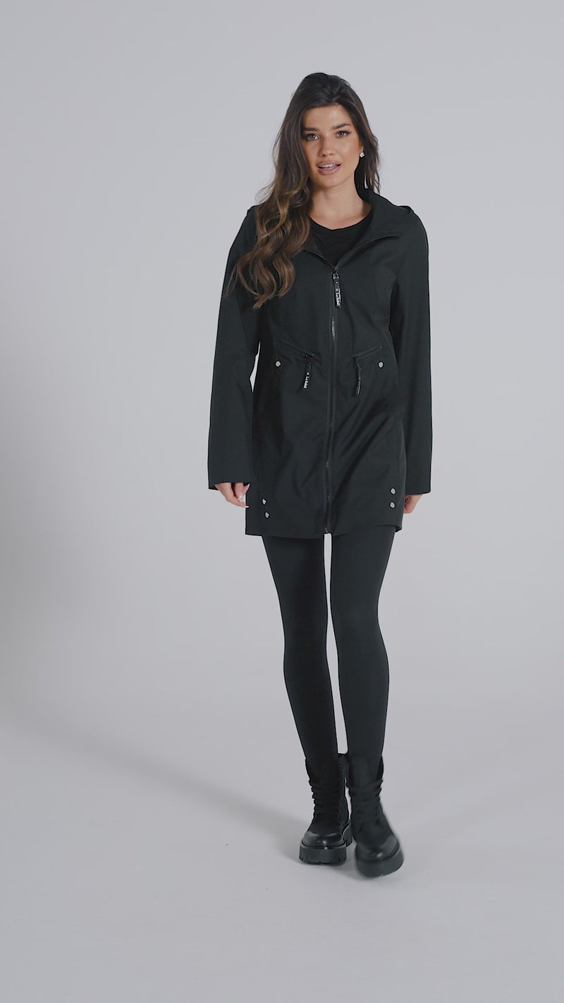 A sporty, rainproof, mid-thigh-length jacket with a fixed hood and a wide zipper. It features two slit pockets on the front and sides, with decorative zippers above the pockets. The back is plain and has no fly. The lined design is perfect for spring and autumn.