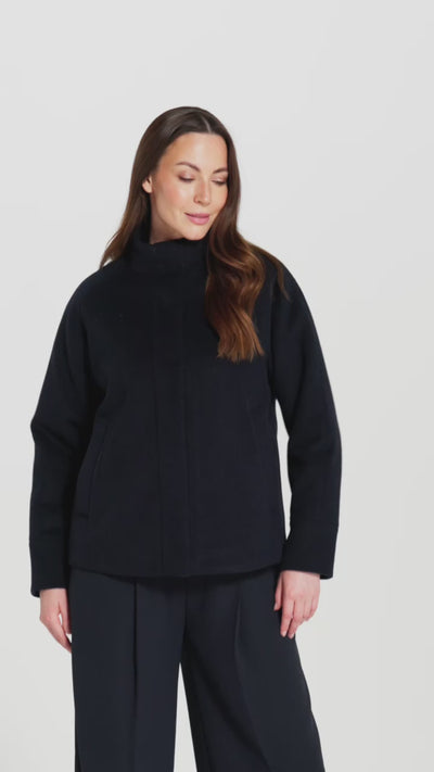 This shorter wool jacket is perfect for when you need something simple yet unique. The hip-length cut , with a slightly longer back , creates a slight asymmetry—a subtle twist that adds character and drapes beautifully. The straight front , free from unnecessary elements, fastens with our signature hidden snaps —minimalist and clean.