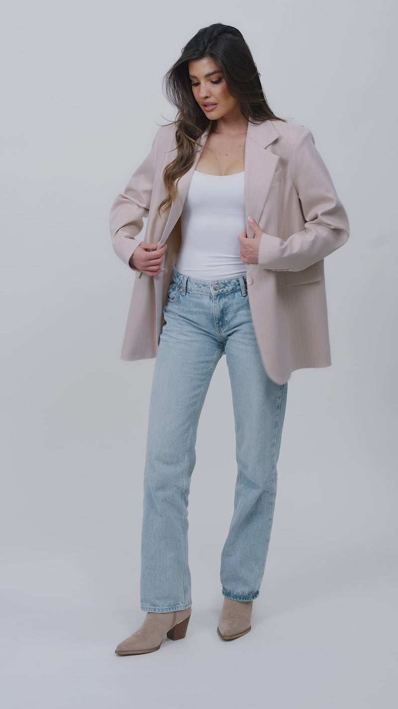 Women's one-size, long, elegant, single-breasted blazer with an oversized fit. Button-up closure, long sleeves, and four-button placket. A classic turn-down collar. Two front pockets with flaps, plus an additional welt pocket on the top left. Lined. The back is plain with a concealed vent.