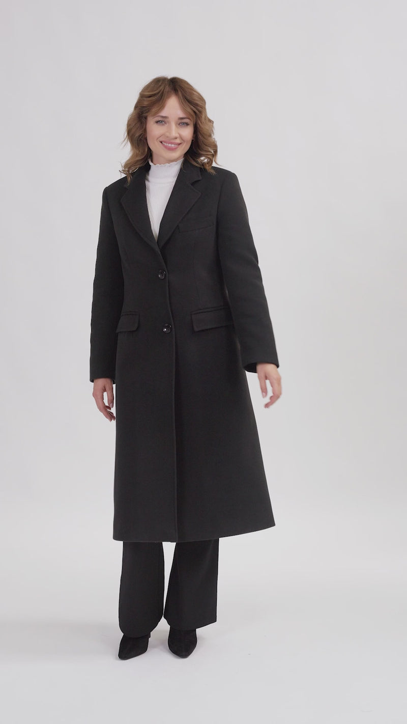 Long, elegant, tailored, single-breasted coat. Button-fastening, with a classic, turned-down collar. Horizontal slit pockets on the sides and on the left bust line. Three decorative buttons on the sleeves. The back is plain, with a high, turn-down vent. Lightly insulated, this coat is perfect for fall and winter.