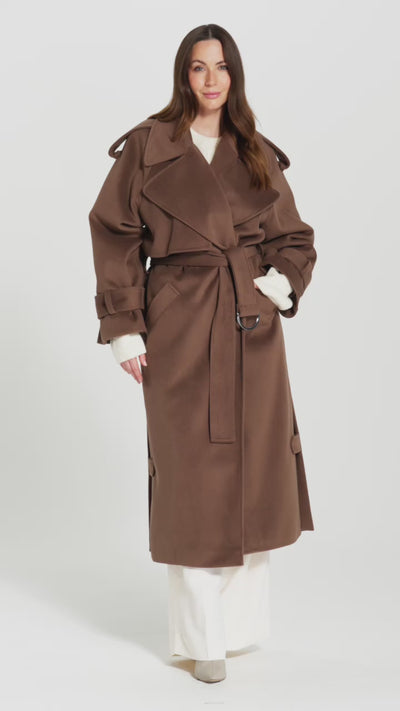 A long belt with a buckle lets you choose how you want to wear this coat—casually or with a waist-cinching fit. Side slits extend to the knees, allowing for natural movement and a light feel when walking. But these aren't just any slits—on the outside, you'll find a faux flap closure that connects the two slits and gives the silhouette an interesting, dynamic line. It's a subtle detail, but it makes all the difference—the coat gains a modern, lightweight shape.