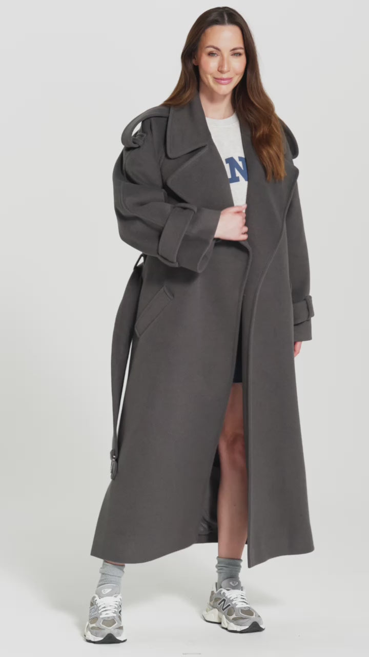 A long belt with a buckle lets you choose how you want to wear this coat—casually or with a waist-cinching fit. Side slits extend to the knees, allowing for natural movement and a light feel when walking. But these aren't just any slits—on the outside, you'll find a faux flap closure that connects the two slits and gives the silhouette an interesting, dynamic line. It's a subtle detail, but it makes all the difference—the coat gains a modern, lightweight shape.