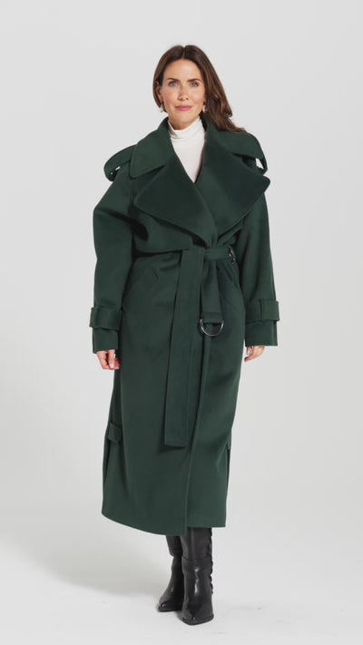 A long belt with a buckle lets you choose how you want to wear this coat—casually or with a waist-cinching fit. Side slits extend to the knees, allowing for natural movement and a light feel when walking. But these aren't just any slits—on the outside, you'll find a faux flap closure that connects the two slits and gives the silhouette an interesting, dynamic line. It's a subtle detail, but it makes all the difference—the coat gains a modern, lightweight shape.