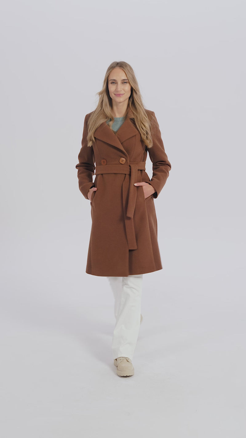 With its fitted cut and waistband, this below-the-knee double-breasted coat flatters your figure while allowing for ease of movement. The classic lapel collar adds a touch of elegance.