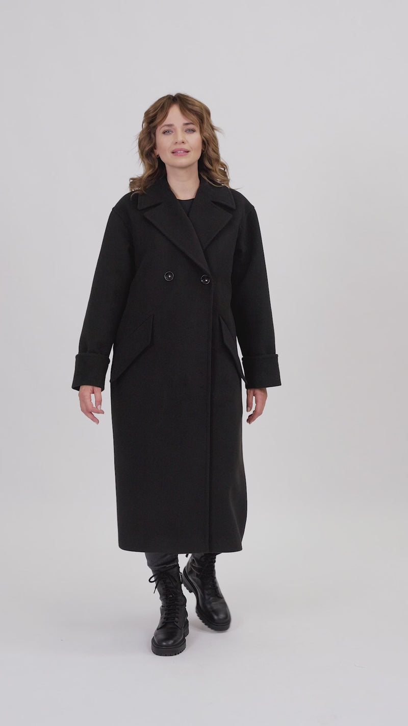 A long, elegant, single-breasted coat fastened with concealed snaps and an additional double button, with a classic turn-down collar. Two slanted front pockets, adorned with flaps, drop sleeves with faux cuffs. This oversized cut encourages ordering a smaller size. The back is plain, without a fly, lined, and insulated, perfect for fall and winter.