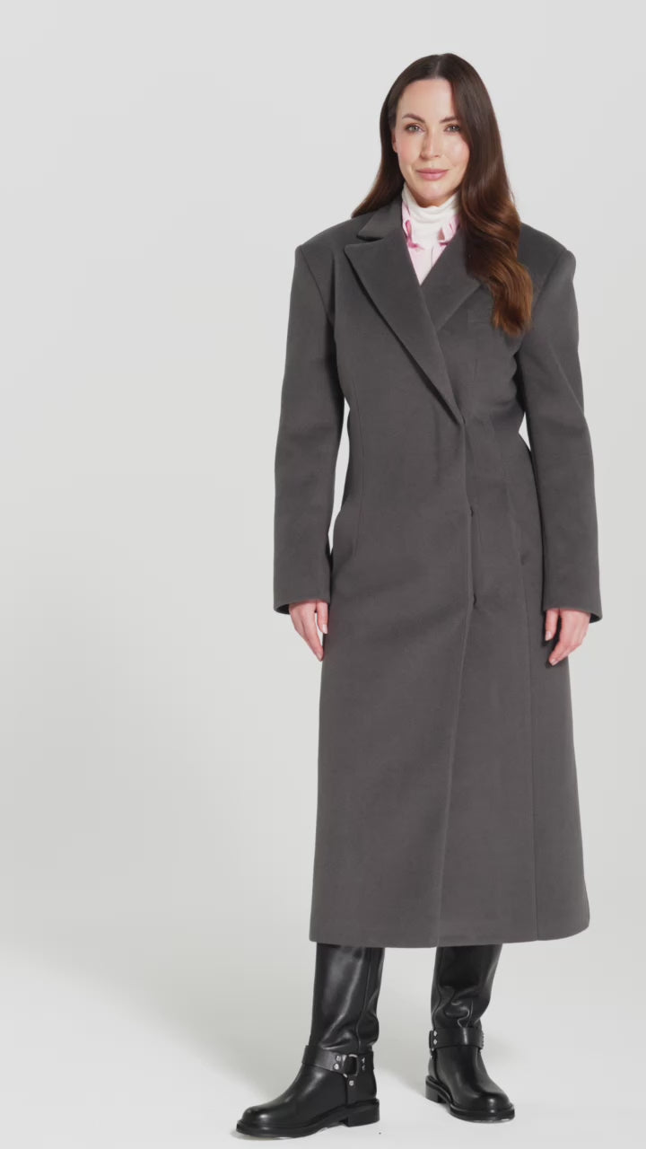 This is Salme's most fitted coat. Designed to flatter the female silhouette, not hide it. Perfect for an hourglass figure—or for any woman who wants to show off a defined waist and a confident curve.