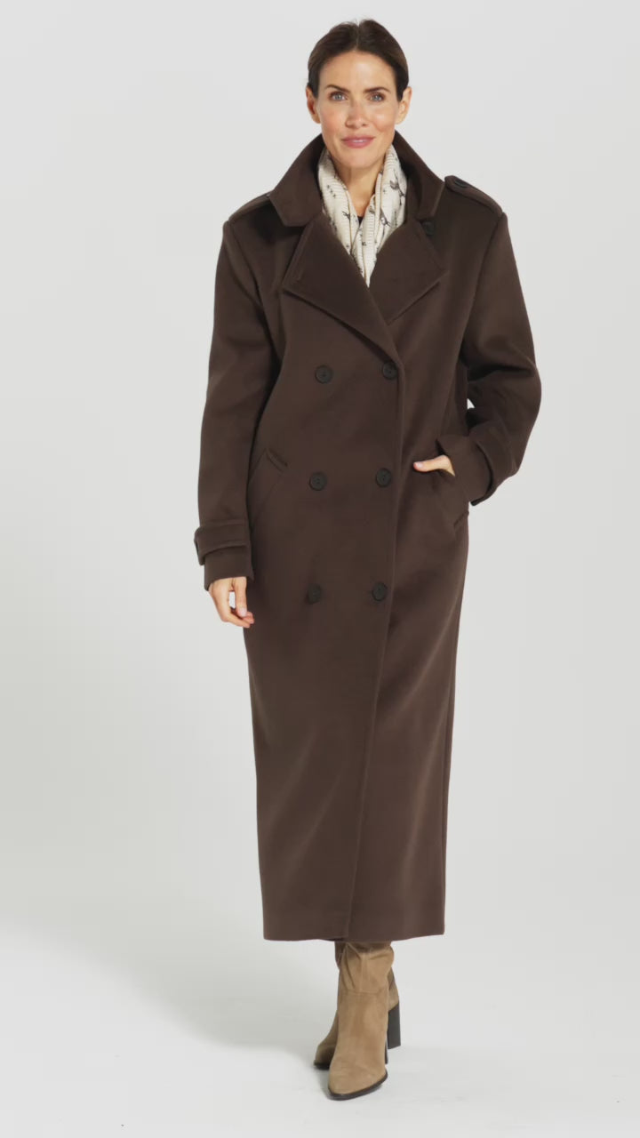 It's a classic military-inspired piece with a modern twist. Maxi length , clean lines, contrasting buttons, and ostentatious shoulder epaulets concealing large shoulder pads —this coat says you're present. And you're not pretending to be anyone else.
