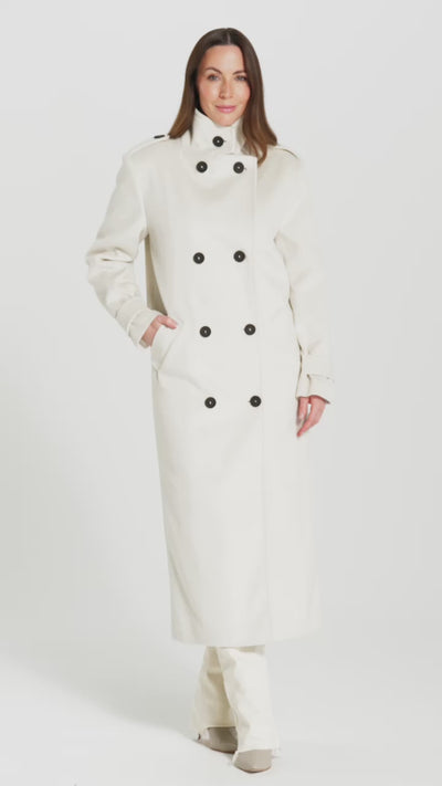 It's a classic military-inspired piece with a modern twist. Maxi length , clean lines, contrasting buttons, and ostentatious shoulder epaulets concealing large shoulder pads —this coat says you're present. And you're not pretending to be anyone else.