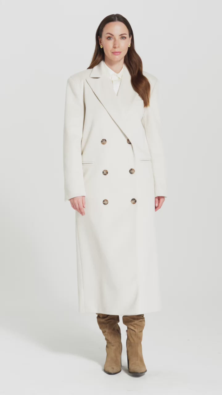 Double rows of buttons add classic elegance without compromising the lightness. Slit pockets with a decorative placket and a buttonhole above the bust are details that show that nothing is left to chance. A slit at the back allows for ease of movement despite the maxi length.