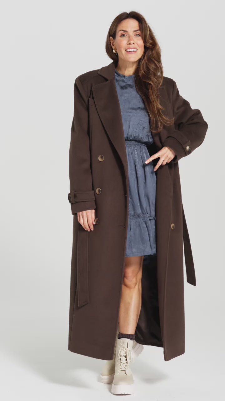 Maxi length —because that's what we do best. The simple belted cut gives you the option to wear it loosely or accentuate your waist, however you like. Large shoulder pads add structure and stability. An additional belt loop at the center back keeps the belt where it belongs—even when you're not using it. No mess, no adjusting.