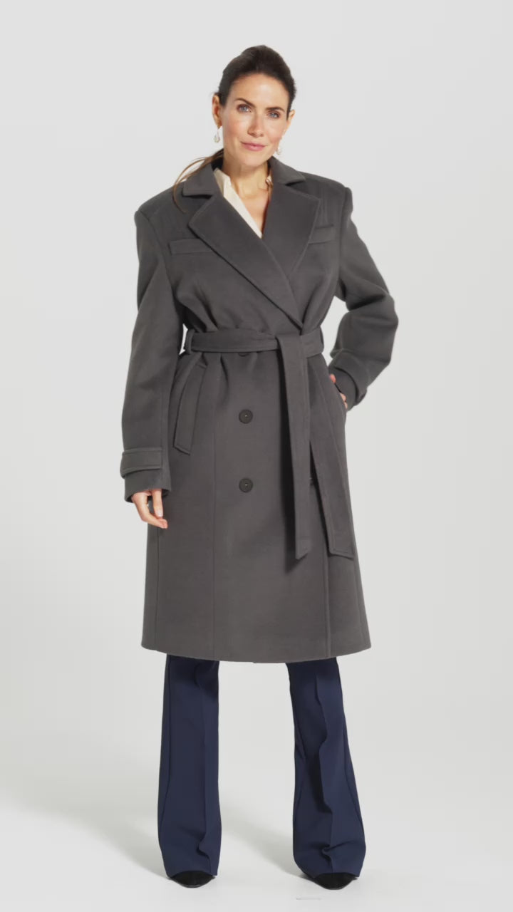 Midi length —whatever you prefer. The simple cut with a belt gives you the option: wear it loosely or accentuate the waist, as you like. Large shoulder pads add structure and stability. An additional belt loop at the center back keeps the belt where it belongs—even when you're not using it. No mess, no adjusting.