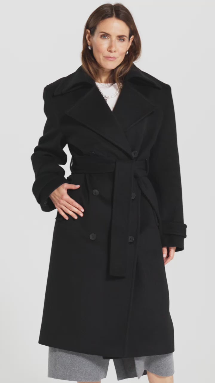 Mid-calf length , a waist adjustment belt and double-breasted buttons provide a balance between structure and femininity.