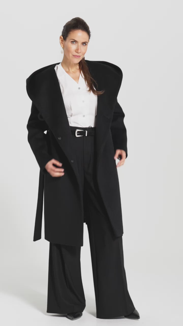 The large, deep hood is more than just a practical element. It protects against the wind but also creates a distinct line—especially when rolled up. It then forms a striking stand-up collar , which not only warms but also shapes the silhouette and gives the coat character. It's a detail that catches the eye but never dominates. The midi length , reaching mid-calf, adds elegance and ensures perfect proportions.