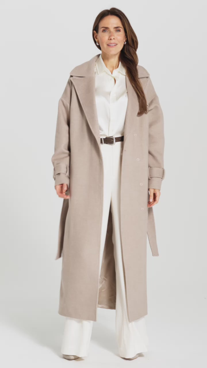 This single-breasted coat, in a fashionable oversized cut, fastens with discreet hidden snaps. It features a banded cuff and two welt pockets for added character. Deep side slits and a pocket-like flap on the left side.