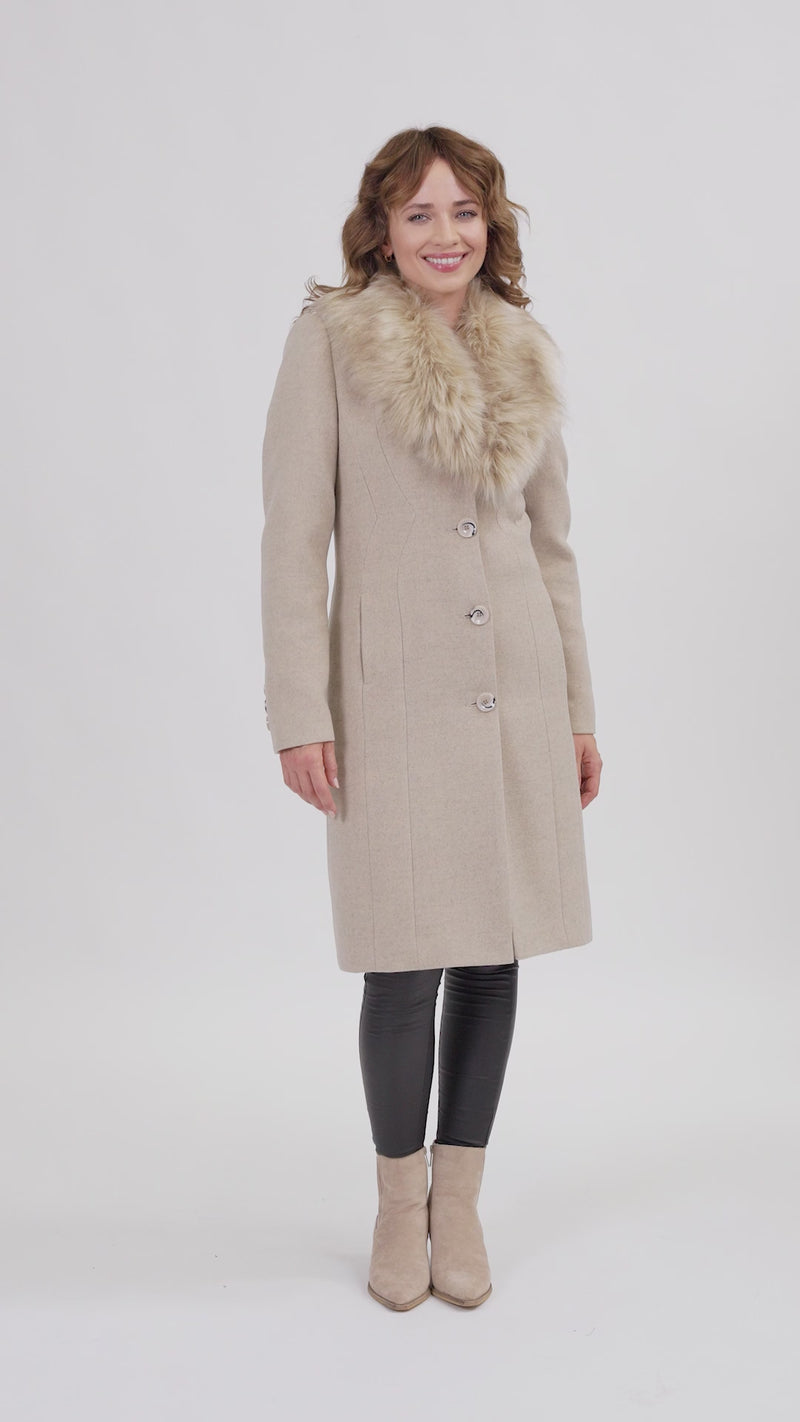 An elegant, tailored, single-breasted, knee-length coat with button closure and two front pockets. Designed with a traditional collar that can be fastened to the neck, this coat features a detachable fur stole. The sleeves are adorned with three buttons. The back is plain and features no vent. This insulated, lined coat is perfect for fall and winter.