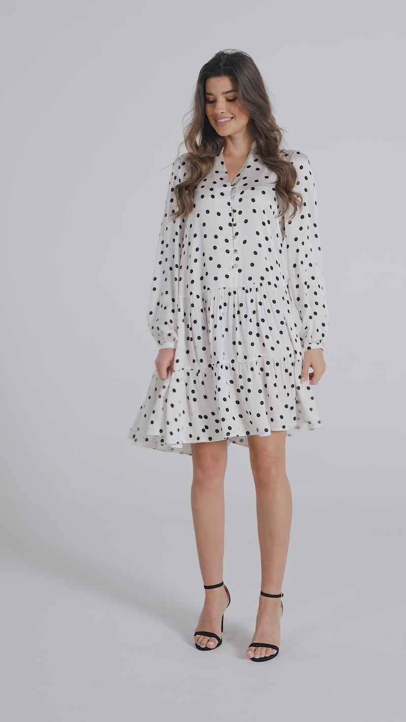 A short dress, cut at the hips, with long sleeves and narrow cuffs fastened with a button. The front features a V-neckline finished with a stand-up collar. The design fastens with decorative buttons from the neckline to the hips. The skirt flares out with two gathered ruffles.
