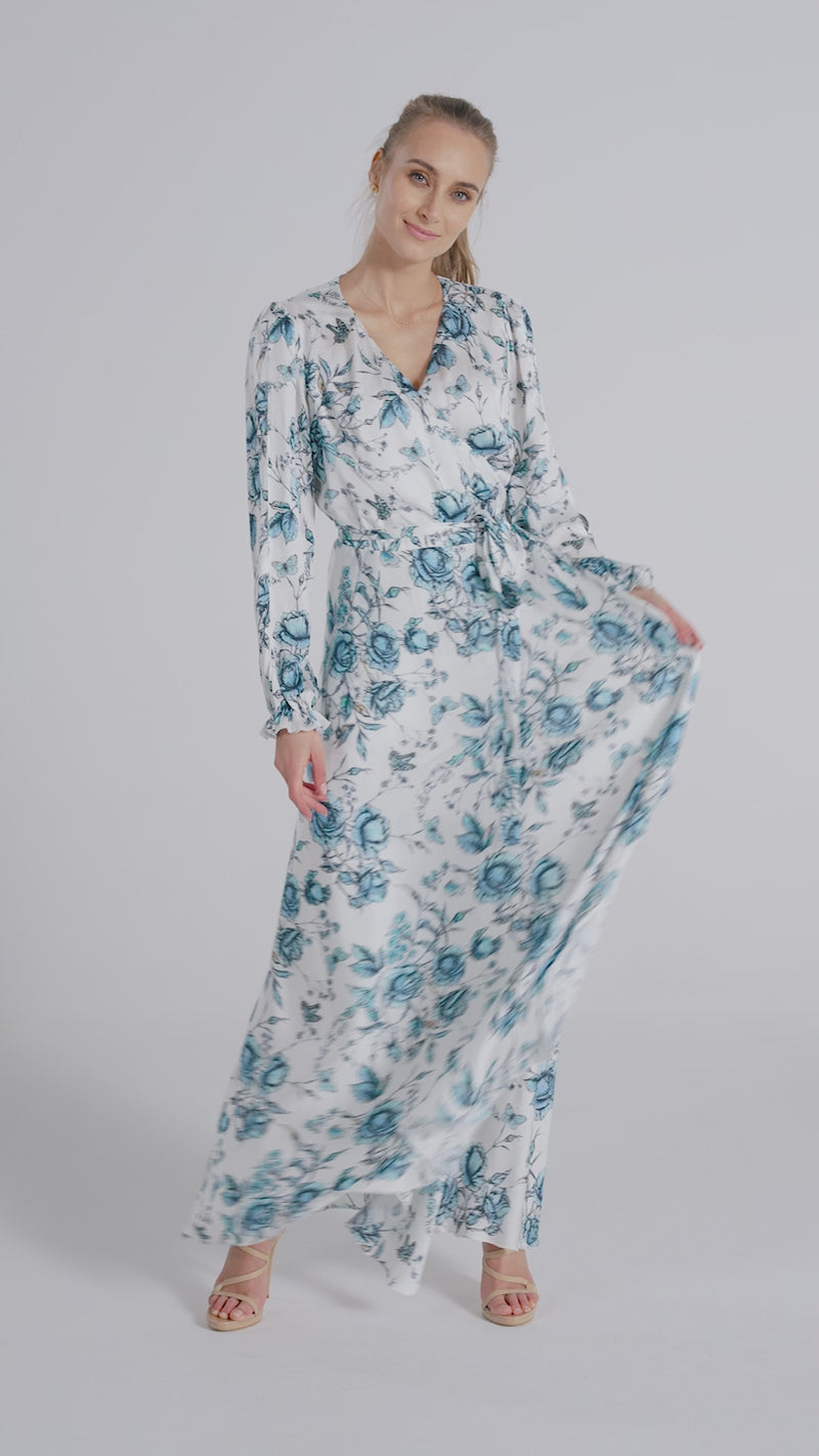 A model with long, slit sleeves finished with an elastic band and ruffles. It is buttoned up at the front.