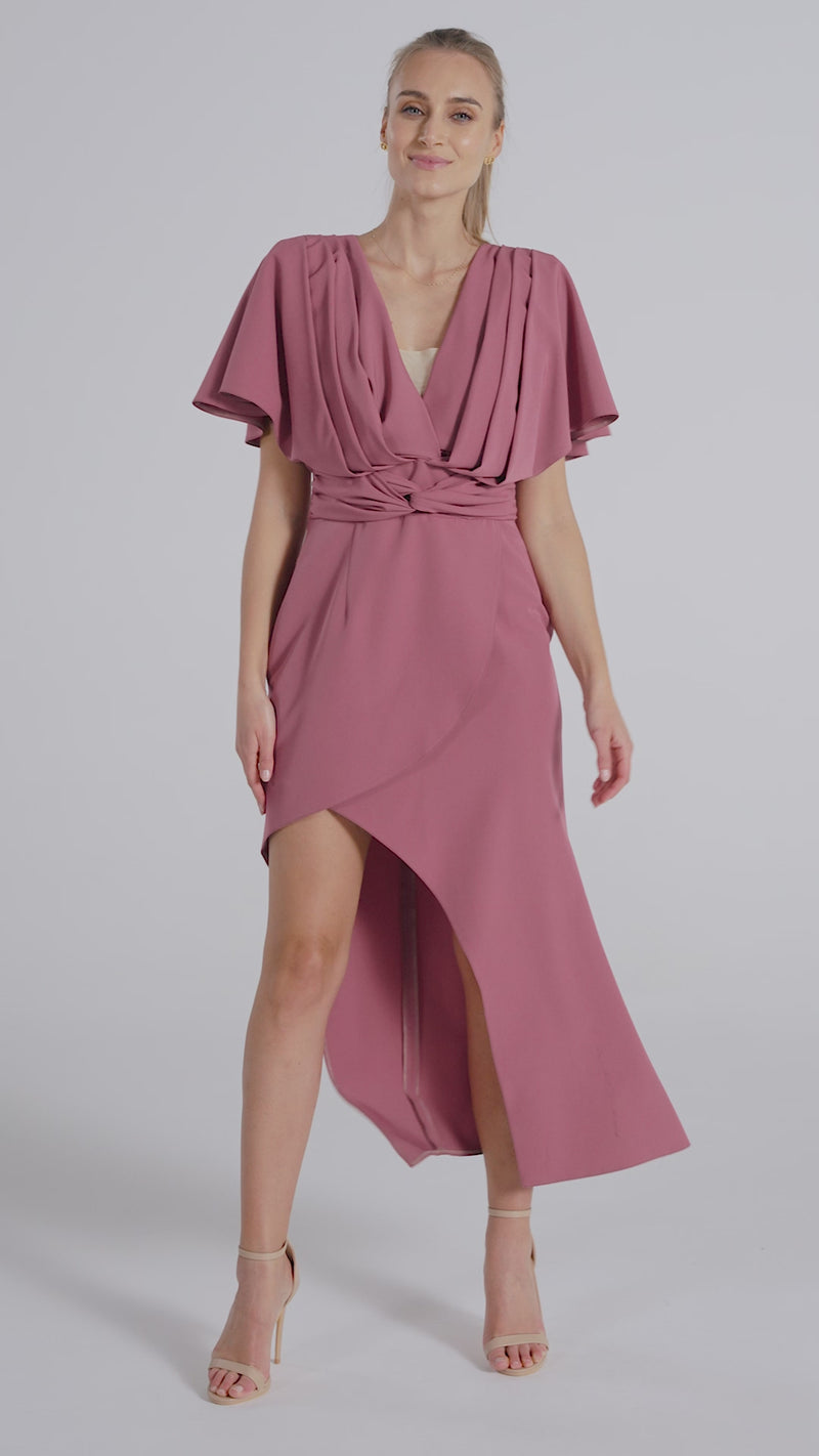 A long, asymmetrical, elegant dress with a wrap skirt and a deep slit up the right leg. The neckline is layered, flowing into flared, flowing, short sleeves. A decorative, draped tie at the waist. The back features a deep slit, fastened with a hook and eye at the top, and a short, concealed zipper at the bottom.