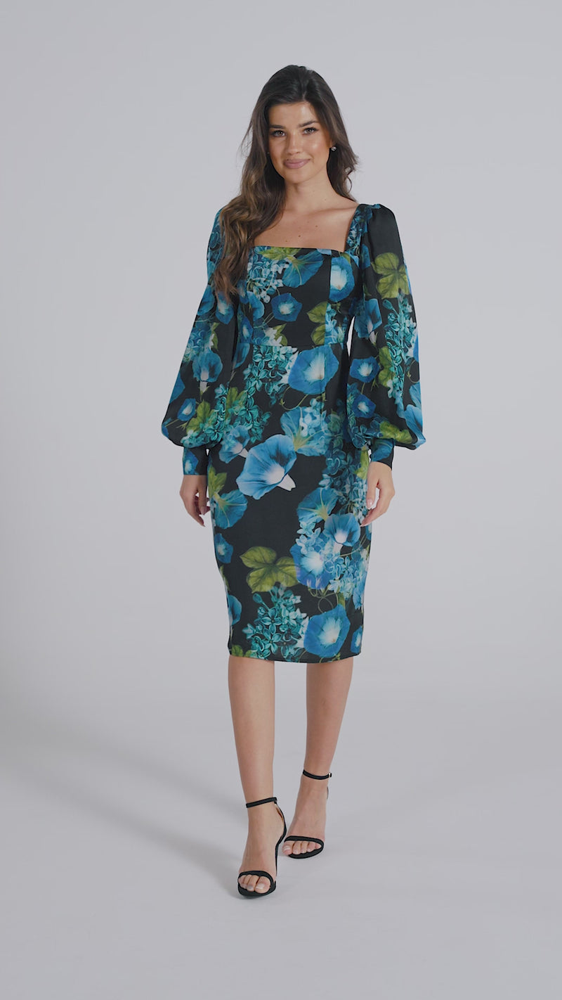 Elegant knee-length dress, lined with a long, puffy skirt.