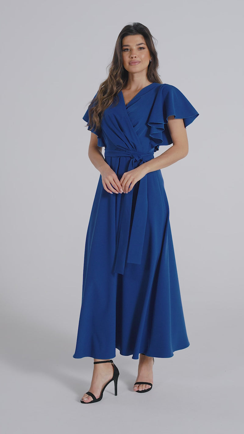 A long, elegant, flared dress, lined, and seamed at the waist. It features a draped V-neckline at the front. Wide ruffles are sewn into the sides, creating butterfly sleeves. The back fastens with a concealed zipper. The dress features a loose belt to accentuate the waist.
