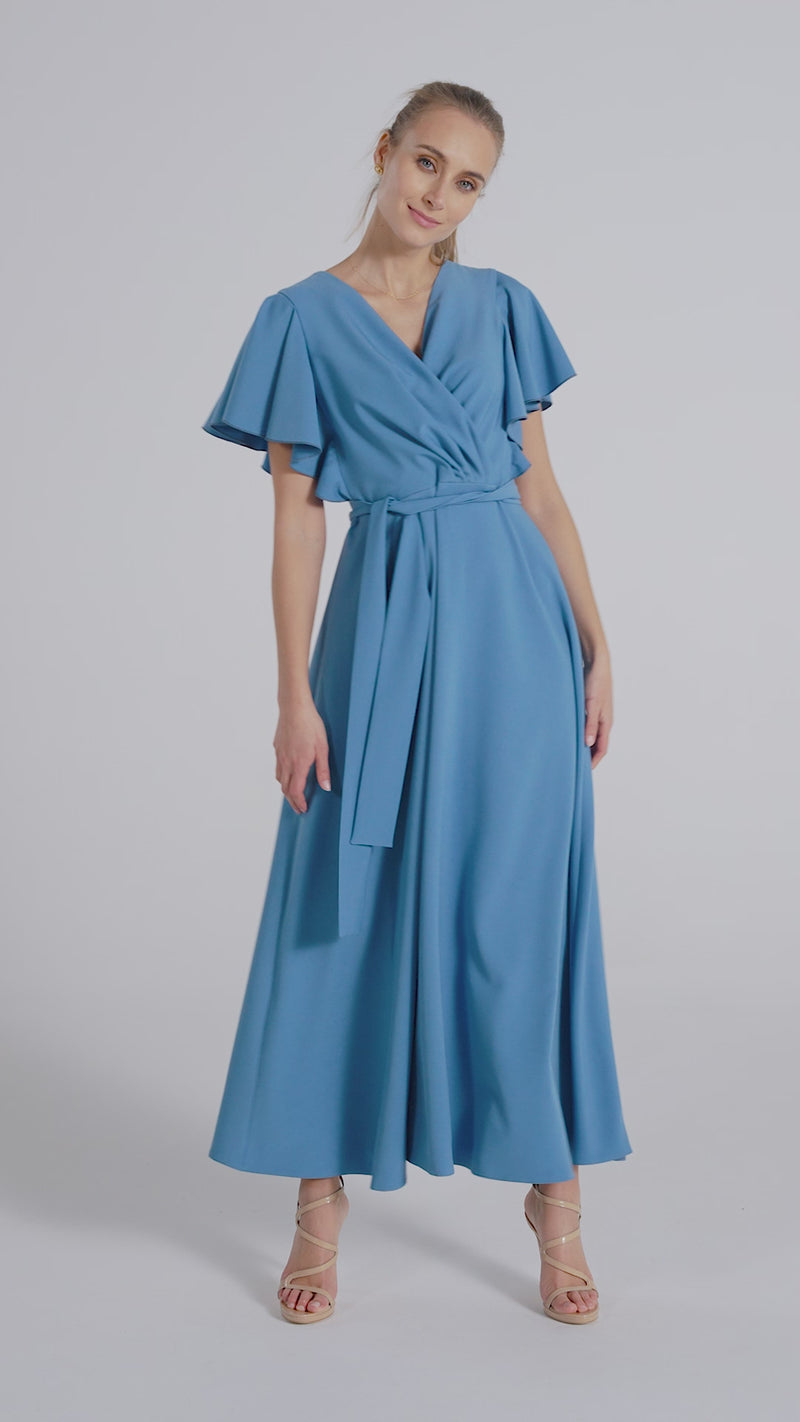 A long, elegant, flared dress, lined, and seamed at the waist. It features a draped V-neckline at the front. Wide ruffles are sewn into the sides, creating butterfly sleeves. The back fastens with a concealed zipper. The dress features a loose belt to accentuate the waist.