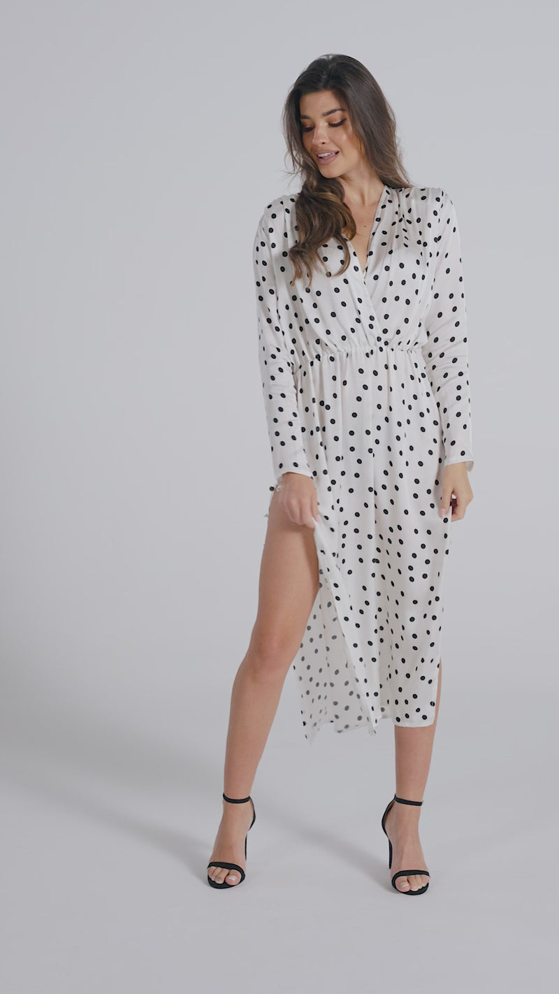 A flowing midi dress with an elastic waistband and long straight sleeves. A deep, wrap-around neckline at the front. The hem features high side slits. The slit is decorated with buttons and can be unbuttoned halfway. The dress features a loose belt to accentuate the waist. The back is plain, with no slit or zipper.