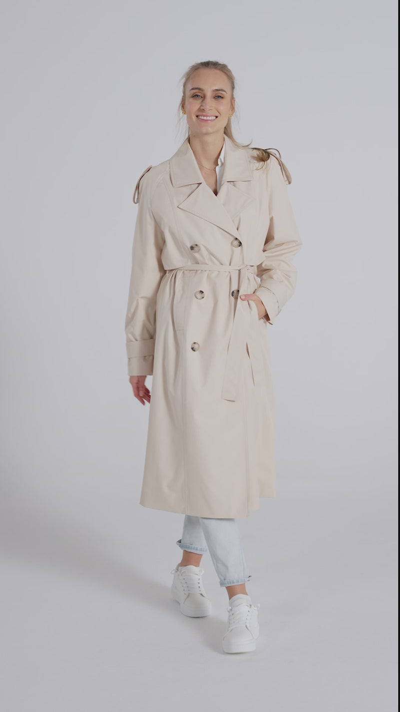 A long, double-breasted, rainproof, button-up trench coat with a classic turn-down collar. The wide raglan sleeves, cuffs, and shoulders feature decorative button-fastened flaps. It features two side slit pockets. A loose yoke at the bust extends to the back. It features belt loops and a belt. A slit at the back. Lined, this style is perfect for spring and autumn.