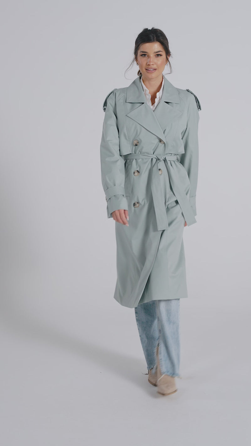A long, double-breasted, rainproof, button-up trench coat with a classic turn-down collar. The wide raglan sleeves, cuffs, and shoulders feature decorative button-fastened flaps. It features two side slit pockets. A loose yoke at the bust extends to the back. It features belt loops and a belt. A slit at the back. Lined, this style is perfect for spring and autumn.